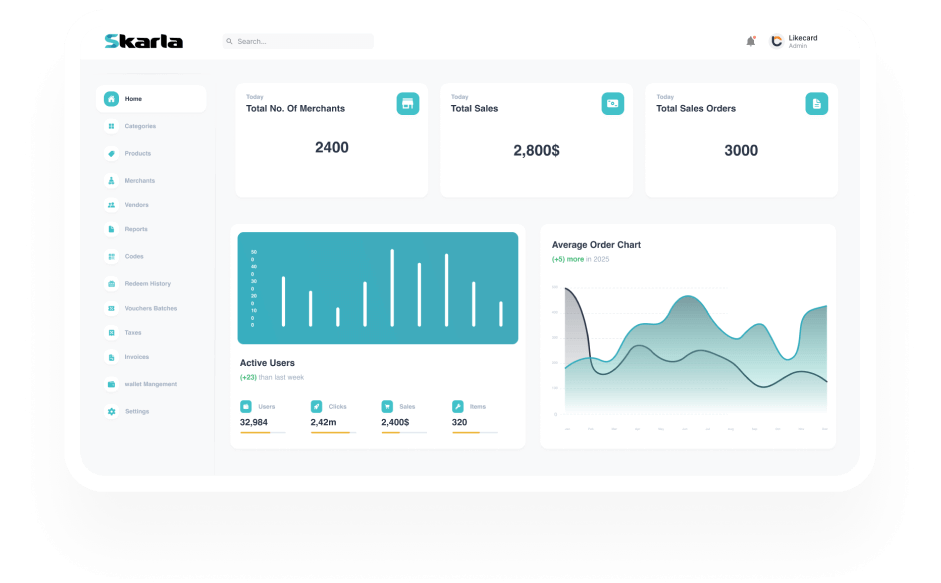 Easily design and manage E-vouchers and Prepaid Gift cards with Skarla’s simple and user-friendly dashboard. Customize denominations, currencies, and SKUs in one place.